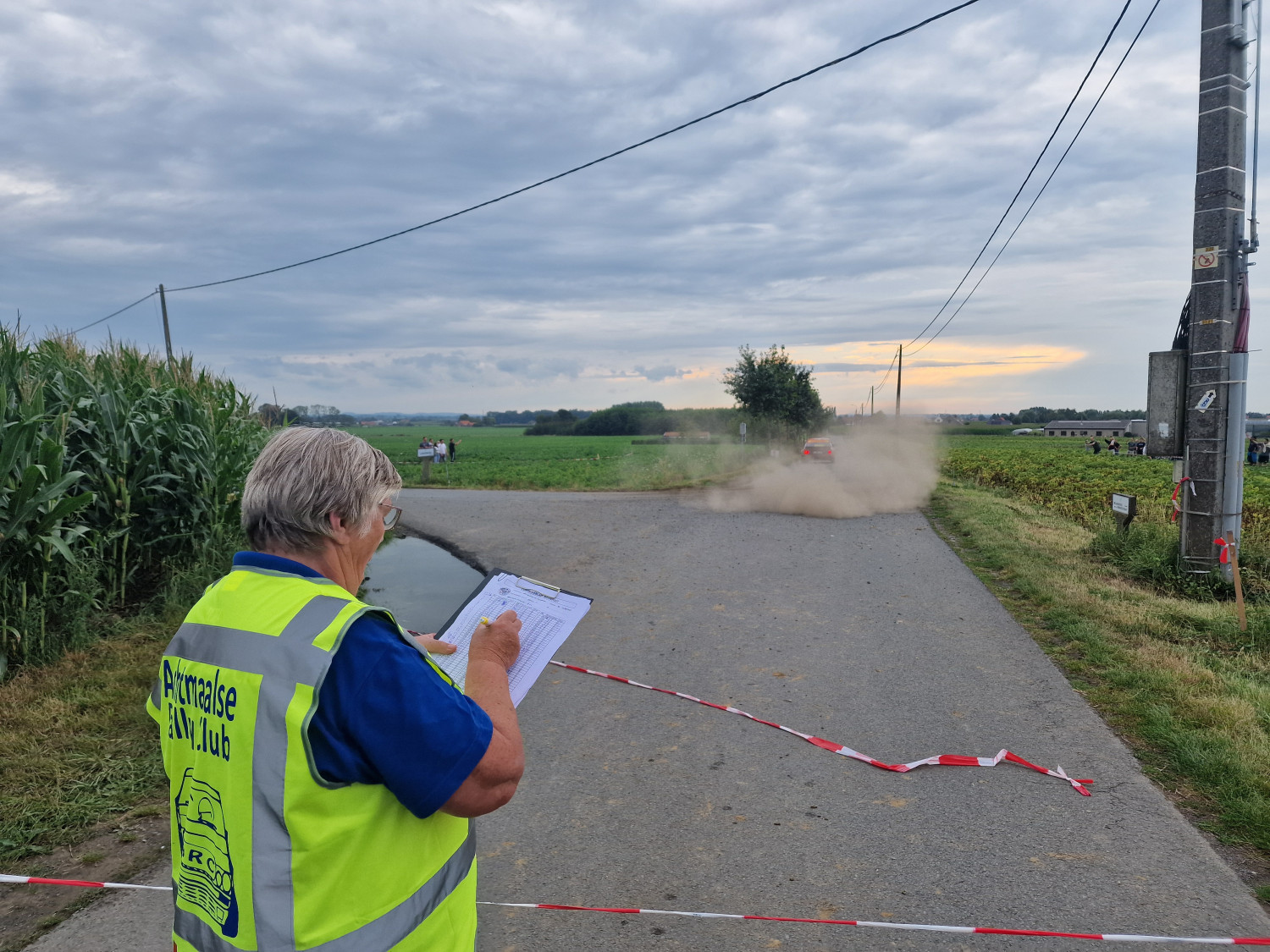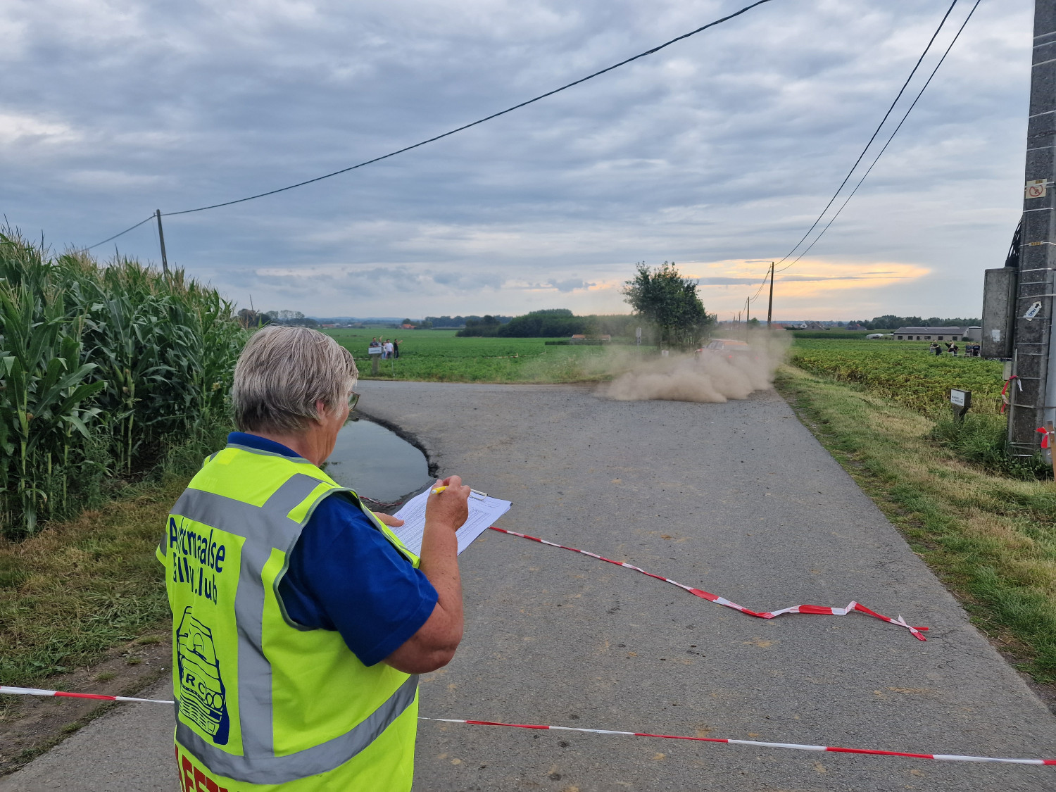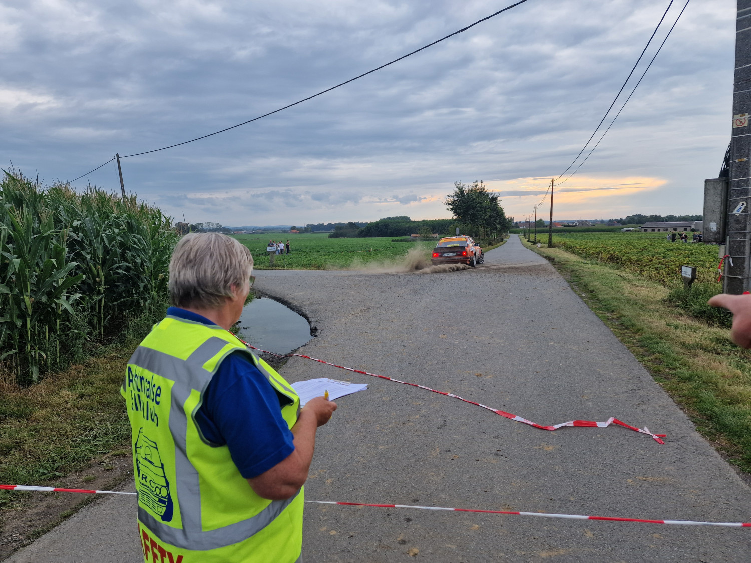 Toen we filevrij voorbij waren aan Antwerpen was er als, maar meer mist. Hierdoor onze snelheid aangepast en even later was er in tegenovergestelde richting net een ongeluk gebeurd waar nog geen hulpdiensten bij waren. Gelukkig was daar net geen dichte mist, anders had het er erger kunnen zijn. Net voordat we er waren nog een afgesloten weg vanwege wegwerken waren we 10 minuten later aan de start van SS Houthulst.  De 4e official was er ook al die had al in België overnacht.